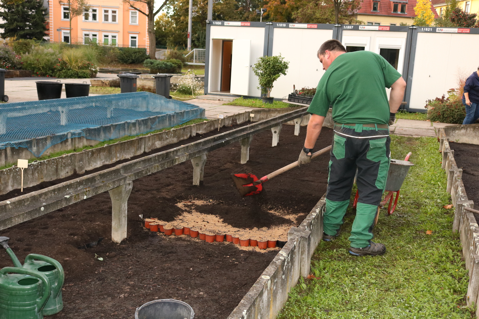 Mehr als 38.500 Blumenzwiebeln werden in diesen Tagen in der Gärtnerei für ihren Auftritt im Frühjahr vorbereitet. Sie finden in Mischungen mit anderen Frühlingsblühern wie Veilchen, Tausendschönchen und Vergissmeinnicht in Pflanzgefäßen Verwendung. Hierfür wurden die Zwiebeln zunächst gewässert und dann in Töpfe gepflanzt.