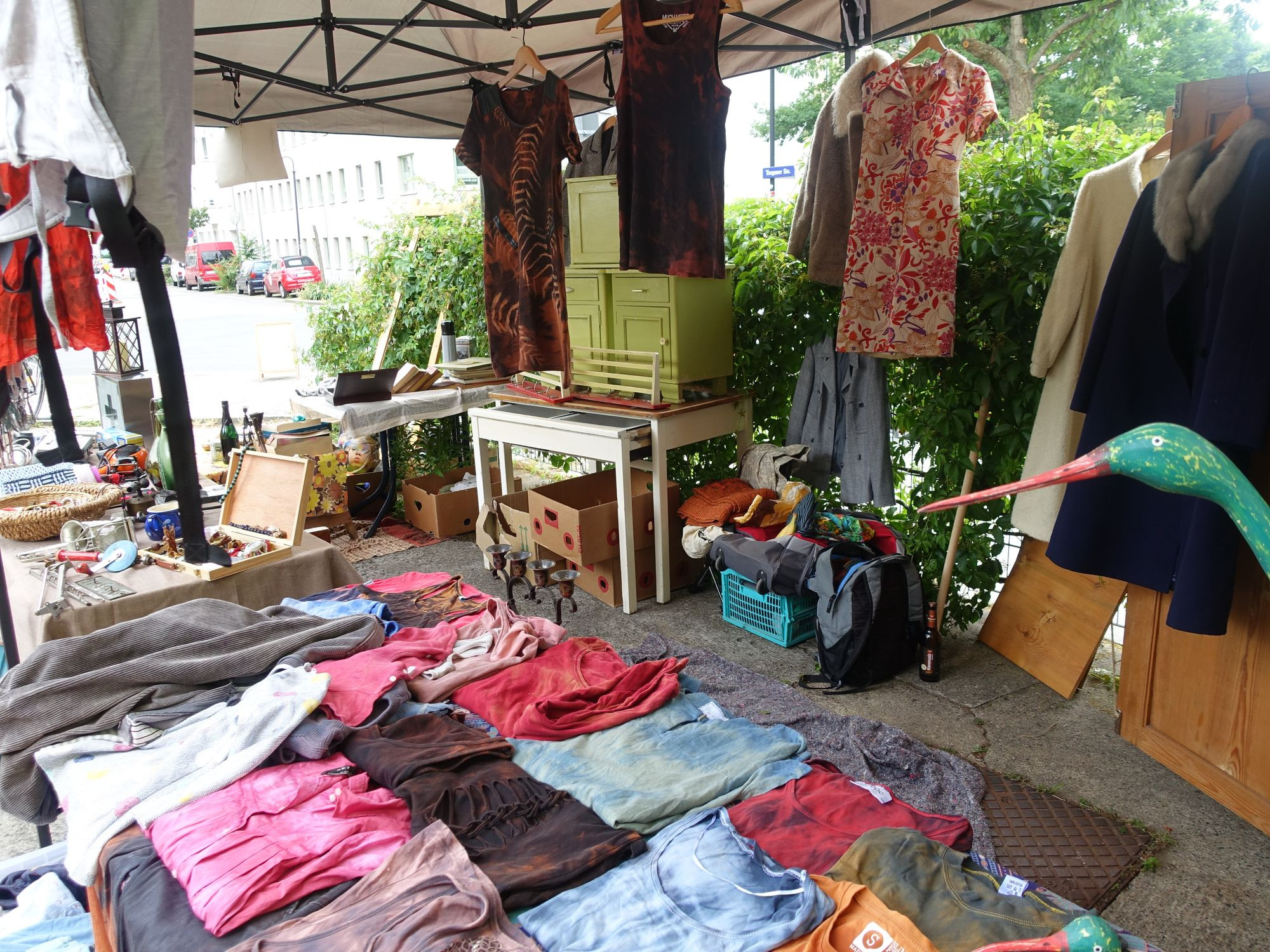 Flohmarkt und Puppentheater, Fotos aus der Wendezeit und Künstlerinnen und Künstler, die in ihre Ateliers einluden. Am Sonnabend durch Pieschen zu bummeln, war eine lohnende Angelegenheit. Auf dem privaten Eckgrundstück an der Ecke Konkordienstraße / Torgauer Straße herrschte reges Kommen und Gehen bei der Premiere von „Rosa’s Flohmarkt“. Namensgeberin Rosa ist eine Hündin, sie gehört zu Christin, Pascal und Richard, die den Markt organisiert haben. Ein Teil der Artikel stamme aus verschiedenen Beräumungen oder von Freunden, anderes wartete schon lange im Keller, um endlich wieder ans Licht zu kommen, erzählten Pascal und Richard. Christin hat sich dem Recyclen von Kleidung verschrieben. Vielen Kleidungsstücken haucht sie mit Batiktechniken ein neues Leben ein.