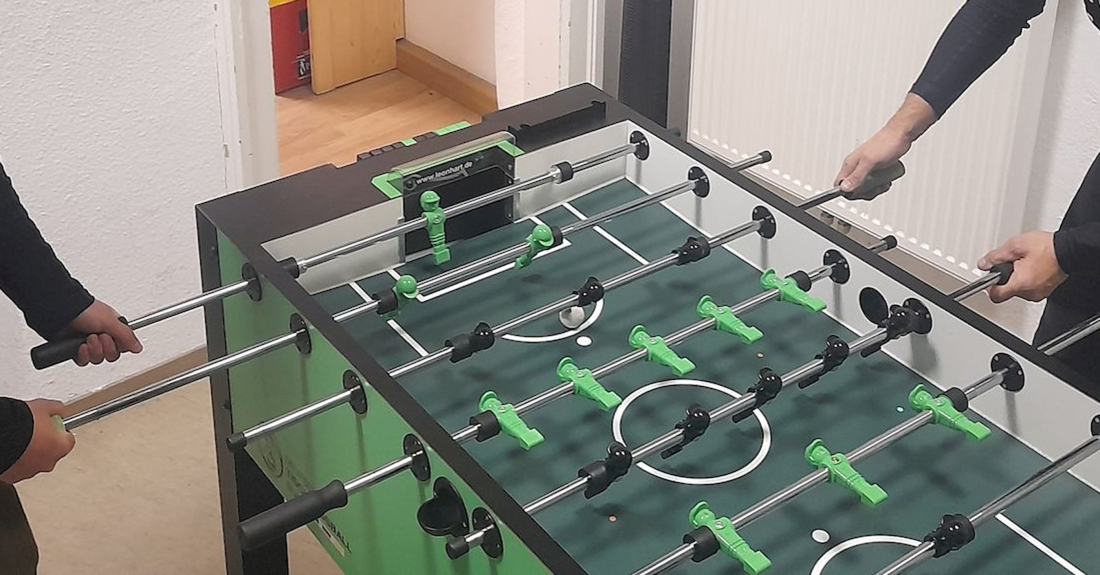 Im Zentrum des Vereinsraums stehen zwei massive Tische mit dem Logo des deutschen Tischfußballverbundes (DTFB). An einem der Tische steht Henry und über den anderen Tisch gelehnt ist Robert. Sie daddeln hier nicht herum. Sie arbeiten am Ballgefühl des Torwarts, an der Ballkontrolle im Mittelfeld, an einer effizienterer Ballannahme der Puppen in der Sturmreihe.