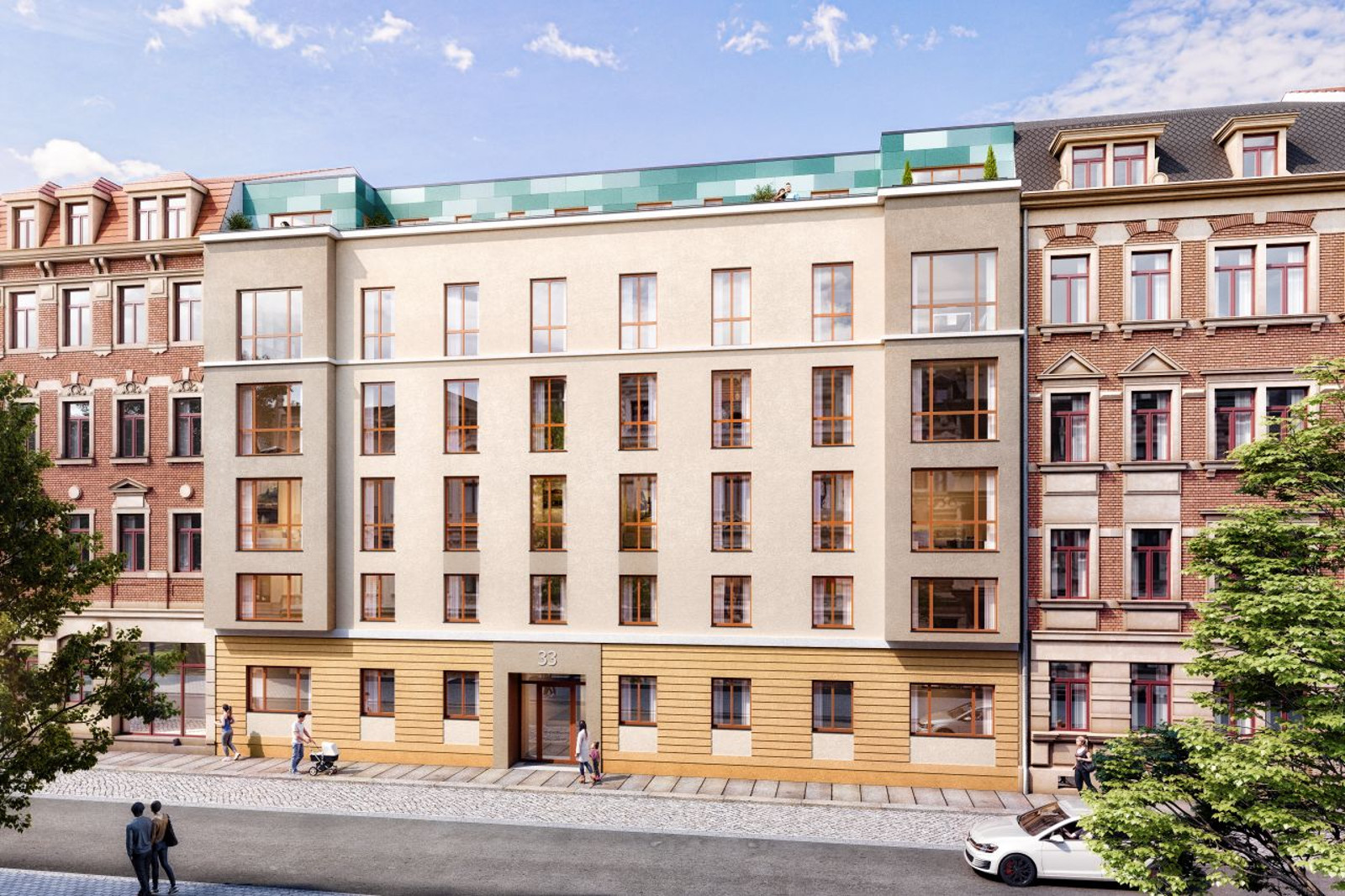 Bei der Energieversorgung haben sich die Bauherren gegen Fernwärme der SachsenEnergie entschieden. Statt dessen sind eine Erdgas-Wärmepumpe und zusätzlich Luft-Wasser-Wärmepumpen geplant. Für die Freiflächen im Hinterhof haben die Architekten eine Grünanlage mit Boulebahn, Spielplatz und Sitzgelegenheiten vorgesehen. Im Frühjahr 2025 sollen die Wohnungen bezugsfertig sein.