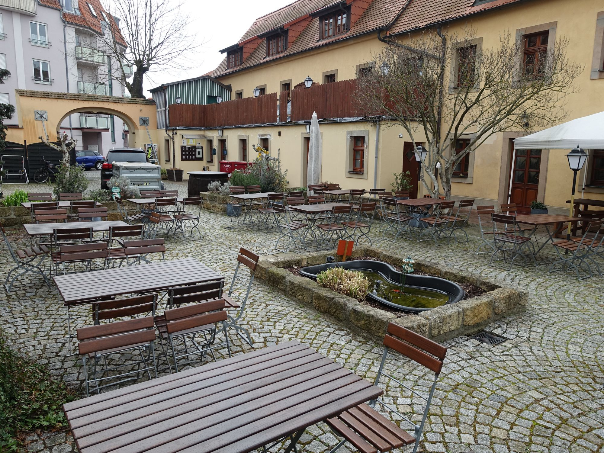 Biergarten: Aufgeräumt und mit frisch geschliffenen Tischen. Foto: W. Schenk