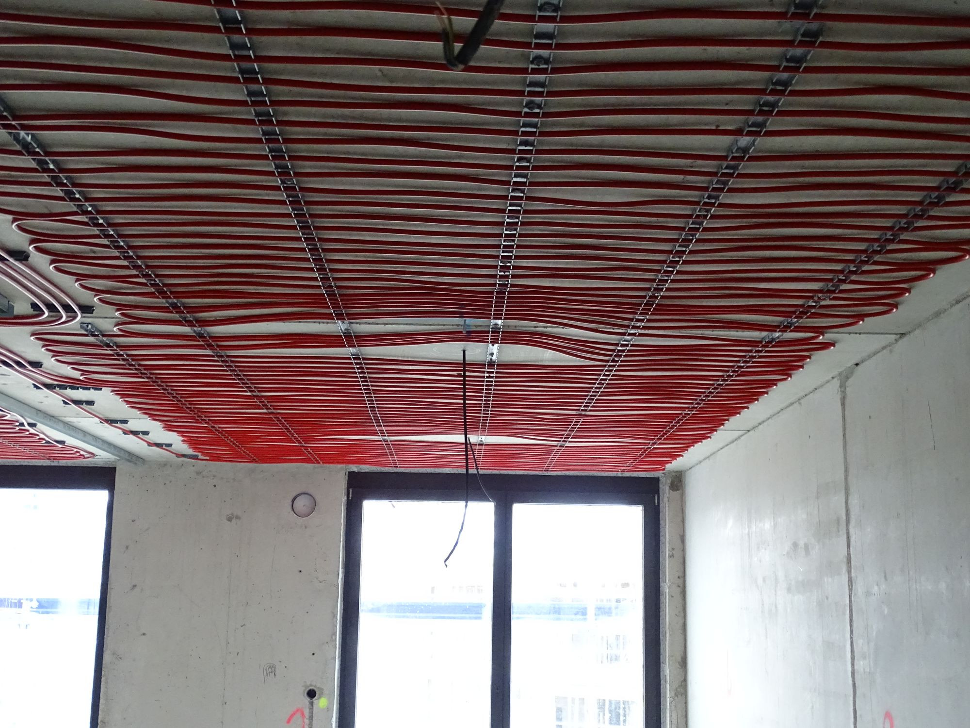 „Der Entwurf der Architekten aus Rotterdem ist aufgrund der großen Glasflächen sehr klimaanfällig“, erläuterte Petr Albl. Bis zu 90 Prozent der Fassaden bestehen aus Glas. Darum wurde in allen 210 Wohnungen eine innovative Deckenkühlung eingebaut. In einem Kreislauf sorgen Grundwasser und in Zisternen gesammeltes Regenwasser, das in den roten, unter Putz gelegten Leitungen an der Decke fließt, für eine Kühlung von oben.