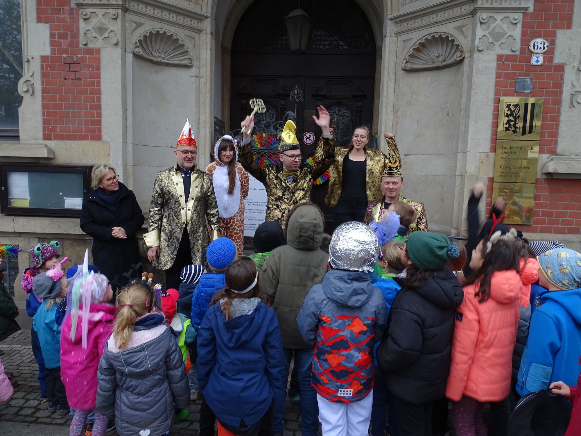 Die Akteure von „Karneval in Pieschen“ feierten heute mit Kindern aus der 26. Grundschule, der Kitas Pfiffikus und Bimbambino den Karnevalsauftakt im Bürgersaal des Rathauses Pieschen. Weil der 11.11. in diesem Jahr auf einen Sonnabend fiel, hatten sich Karnevalisten und das Rathaus-Team auf den 17. geeinigt. Erstmals wurden die Kinder im liebevoll geschmückten Bürgersaal empfangen. „Endlich mal im Warmen“, freute sich Karnevalist Lutz Herrmann. Die letzten Jahre fand das Event bei kühlen Novembertemperaturen im Rathaushof statt. Bevor es aber heute in Polonaise-Formation die Treppen hoch ging, hatte Benjamin Kemper vom Karneval in Pieschen vor dem Rathaus gemeinsam mit den Kindern den Schlachtruf „Ka Pieschen“ geübt. Auf sein „Ka“ schmetterten ihm die Kinder ein lautstarkes „Pieschen“ zurück.