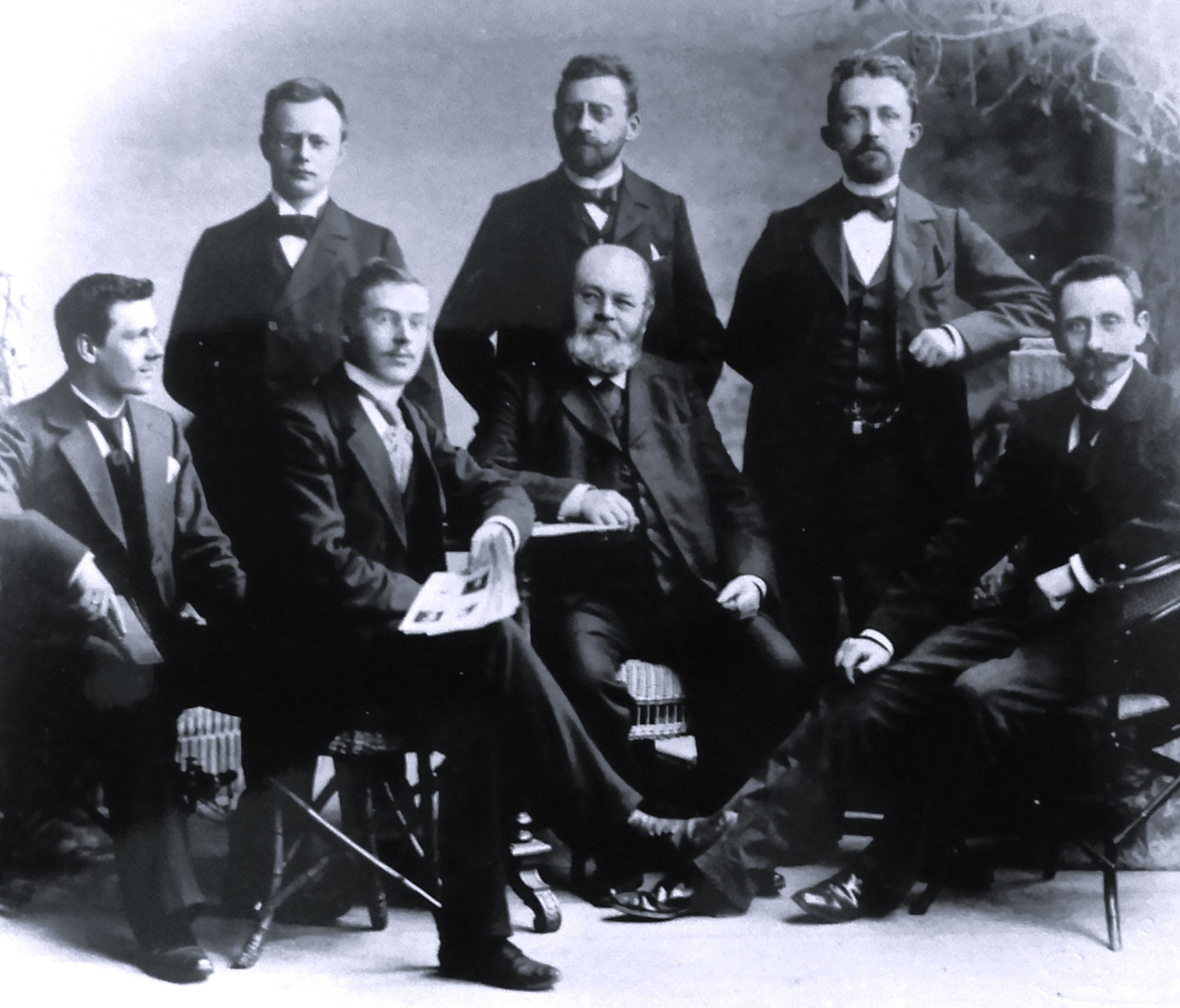 Für die Unterrichtung der 290 Jungen und 300 Mädchen standen außer dem Direktor noch sechs Lehrer zur Verfügung. Alle hatten schon an der ersten Trachauer Schule unterrichtet. Das waren Julius Otto Junge, Wilhelm Oskar Arthur Lindner und Paul Georg Schürer (hinten von links) sowie Kurt Georg Nitzsche, Alwin Matthes, Direktor Karl Friedrich Israel und Hugo Ursin (vorn von links). Während alle Genannten in der Gemeinde wohnten, war die zur Lehrerschaft gehörende Lehrerin für weibliche Handarbeiten Helene Jäger in Dresden zu Hause. Unbesetzt zum Schuljahresbeginn (April 1899) war die Stelle eines siebten Lehrers.