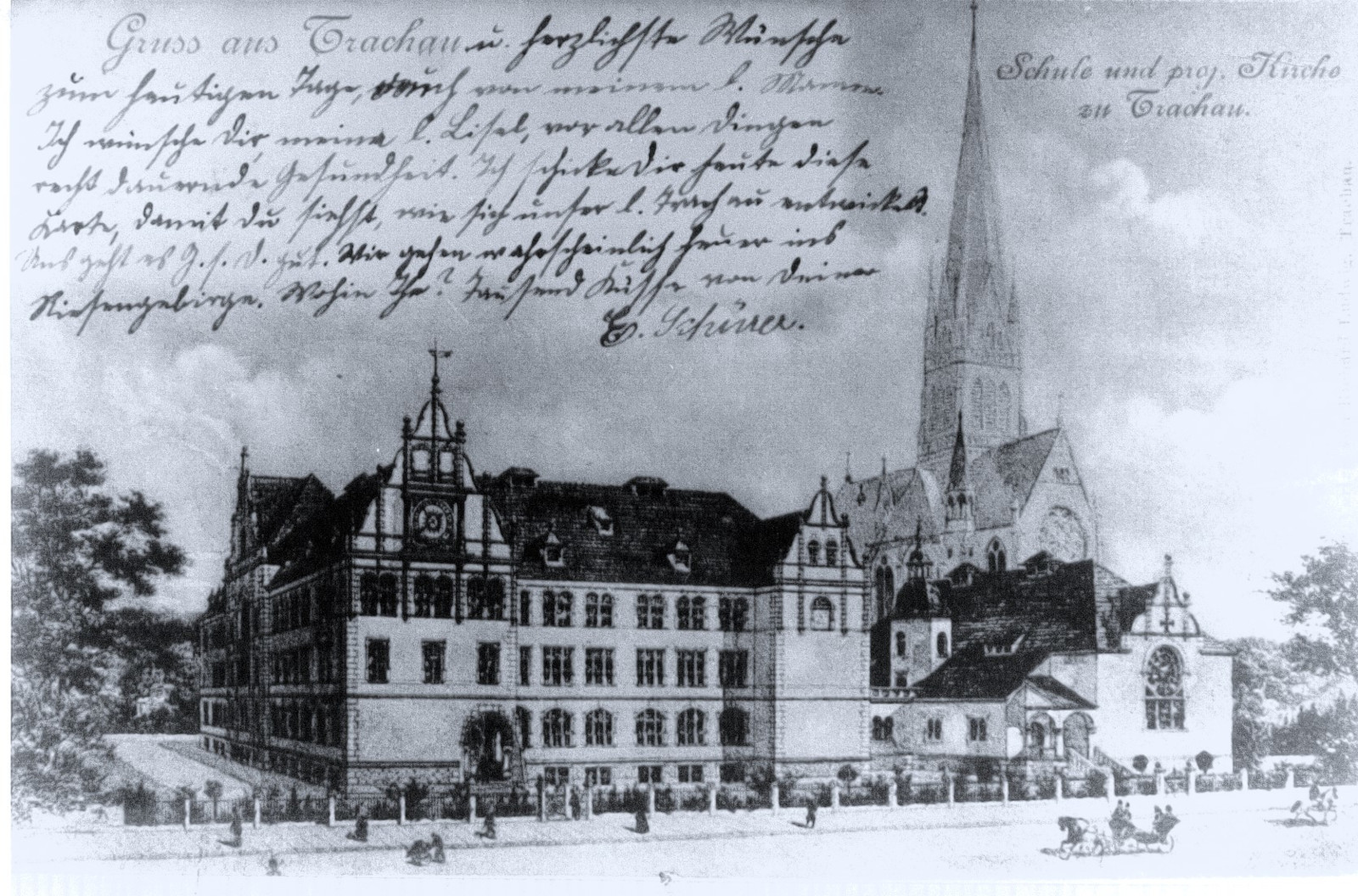 Und weiter hieß es im Beitrag zur Schulhausweihe: „Der 15. März gestaltete sich zu einem hohen Festtag für die gesamte Gemeinde. Goldene Strahlen entsendend, schaute die Sonne vom blauen Himmel hernieder […] und in fröhlichen Scharen zogen in Festkleidern die Jungen und Mädchen, letztere meist in weißen Kleidern mit grünen und weißen Kränzen im wallenden Haar, nachmittags gegen drei Uhr auf den Turnplatz des alten Schulhauses (heute Alttrachau Nr.52). Die Abschiedsrede an das alte Haus hielt Schuldirektor Carl Friedrich Israel. Danach ordnete sich der Festzug und bewegte sich zum neuen Schulhaus.“ Das alte im Jahre 1873 erbaute Schulhaus erwarb wenig später die Gemeinde Trachau für 43.000 Mark und eröffnete im Erdgeschoss eine Kinderbewahranstalt.