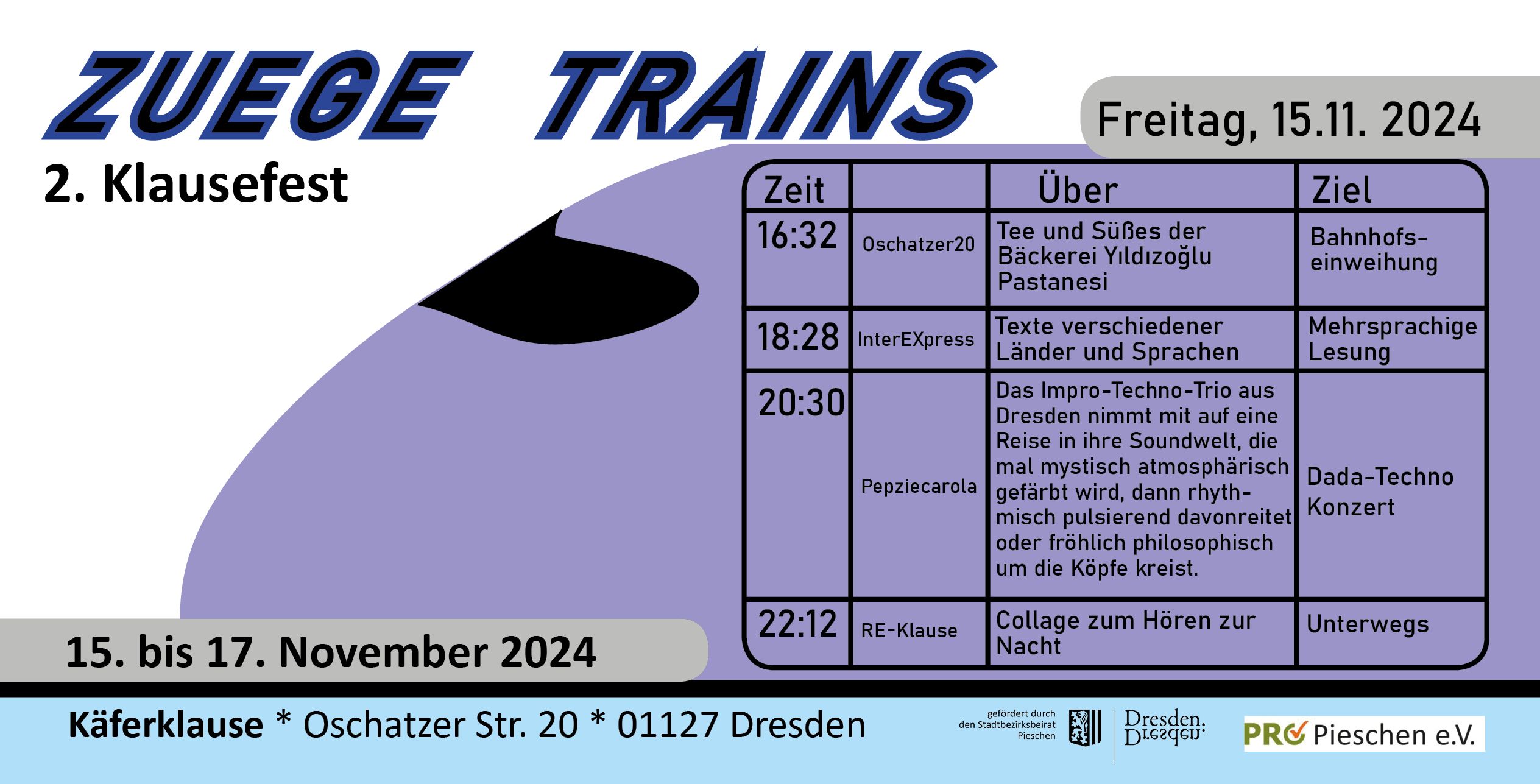 Von Freitag bis Sonntag öffnet die künstlerische Pop-up-Kneipe „Käferklause“ auf der Oschatzer Straßen ihre Pforten: Life-Musik, Lesungen, Austausch und Köstlichkeiten gibt es für alle, die am Wochenende „auf den Zug aufspringen“ möchten. Denn zum Thema „Züge“ veranstalten die Kunststudenten der Hochschule für Bildende Künste Dresden (HfBK) ein kulturelles Reiseerlebnis: Das Zweite Klausefest. Die Käferklause wird vom Treffpunkt zum Bahnhof, vom Kunstraum zum Zug-Waggon. „Jeder, der mag, kann einsteigen und mitgenommen werden, so Maria Exposito. Sie plant das „Train-Festival“ am Wochenende.