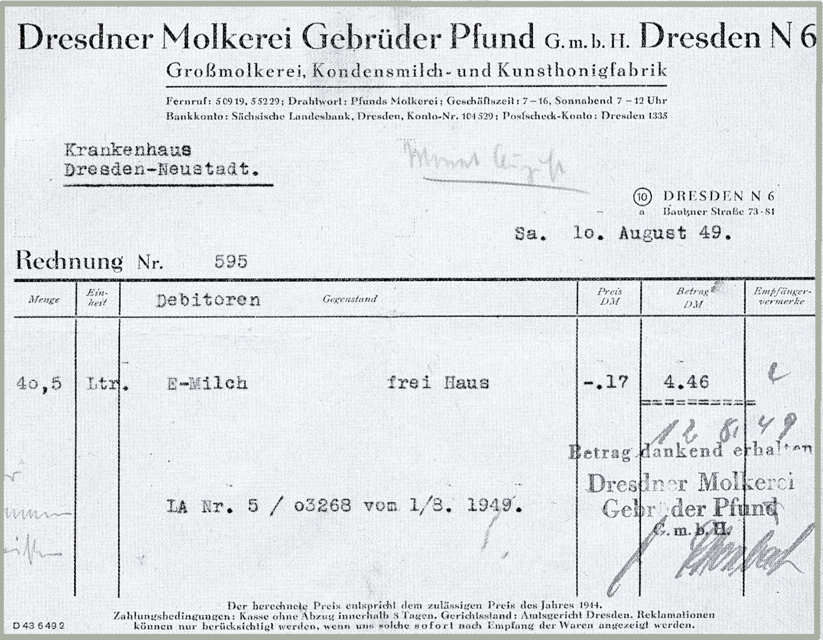 Unterschrieben vom verantwortlichen Arbeitsschutzinspektor des Arbeitsamtes wurde am 12. August 1949 dem Krankenhaus mitgeteilt: „Termin zur Einreichung der Anträge auf Gewährung von zusätzlicher Milch war laut amtlicher Bekanntmachung der 18. Juni 1949. Alle im Juni eingegangenen Anträge wurden von hier bearbeitet. Inzwischen ist das Kontingent erschöpft. Ihr Antrag muß daher leider abgelehnt werden. Es wird Ihnen anheimgestellt, Ihren Antrag bei Beginn der nächsten Zuteilungsperiode Ende September 1949 zu erneuern.“