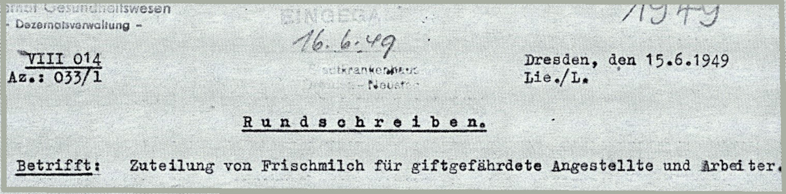 Am 16. Juni 1949 erreichte die Verwaltung des Stadtkrankenhauses Dresden-Neustadt ein weiteres Rundschreiben, diesmal eines des Dezernats Gesundheitswesen beim Rat der Stadt Dresden (Sitz Elsa-Fenske-Straße). Es betraf die „Zuteilung von Frischmilch für giftgefährdete Angestellte und Arbeiter“. Laut Anordnung der Deutschen Wirtschaftskommission bekamen nach 1948 alle Angestellten und Arbeiter, die in Röntgen- oder Radium-Instituten beschäftigt waren, eine solche Zuteilung. Die Deutsche Wirtschaftskommission hatte im Frühjahr 1948 die zentrale Verwaltung der größten Betriebe in der sowjetisch besetzten Zone übernommen. Sie hatte das Recht, Verordnungen zu erlassen.