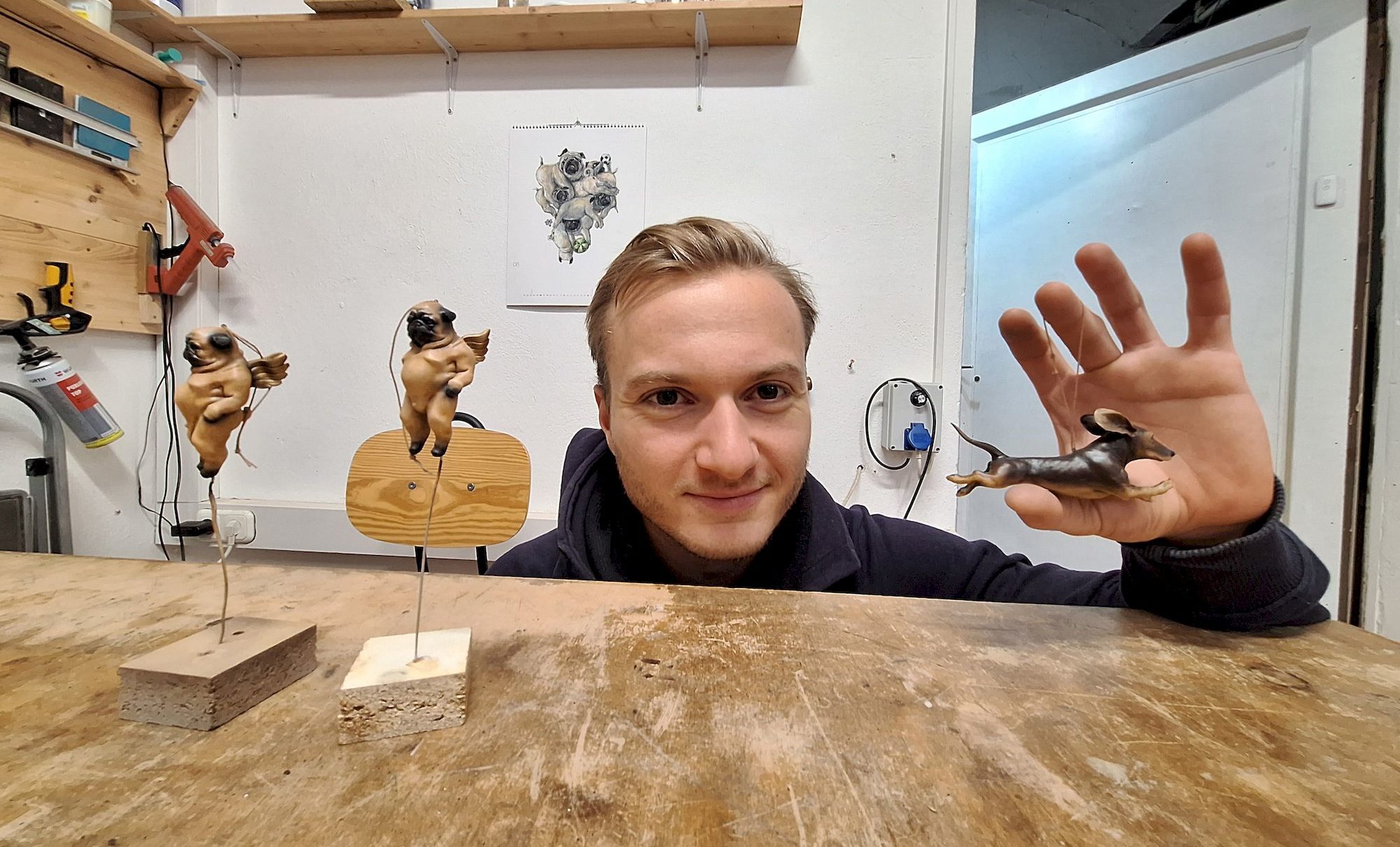 Eigentlich hat sich Leopold Dietrich auf Miniaturen spezialisiert, entwirft Soldaten, Eulen oder Möpse und schickt die skizzierten Unikate hundertfach durch