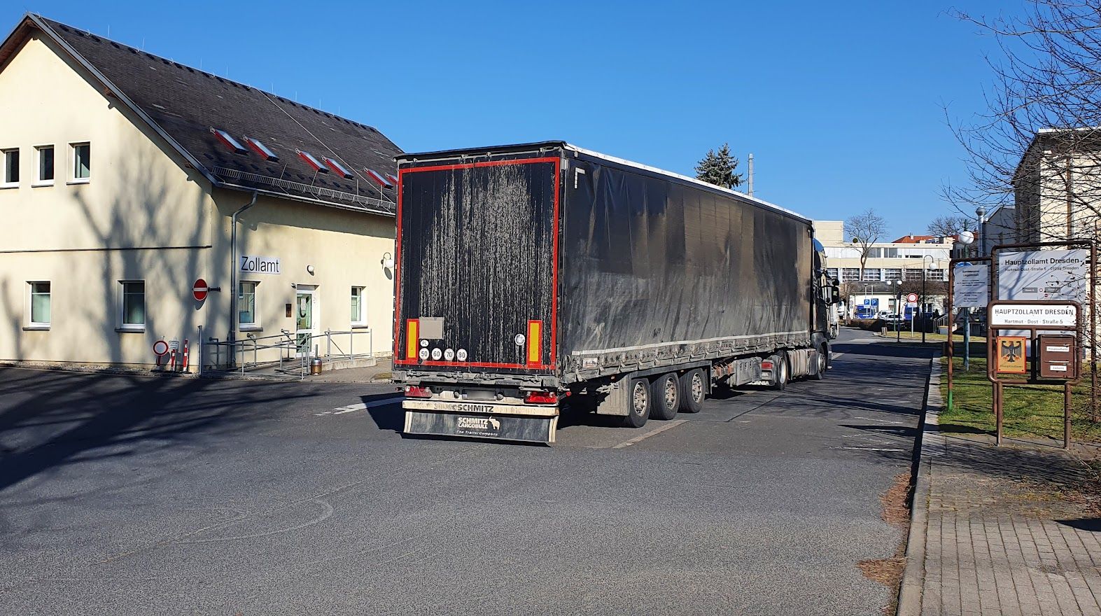 Ungefähr in der Mitte zwischen Stauffenbergallee und Fabricestraße befindet sich das Dresdner Hauptzollamt (Dresden-Stadtplan). Die Anfahrt von Lkw, die vor