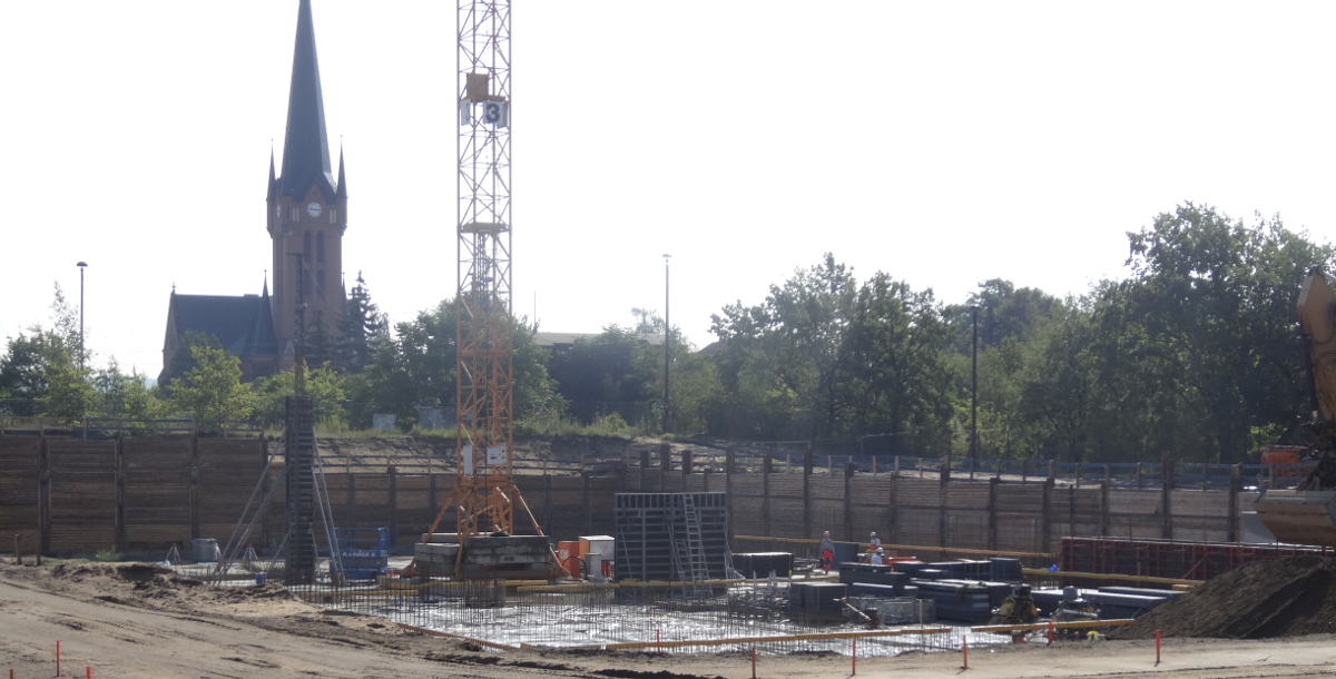 Auf dem neuen Schulcampus Gehestraße sind die Arbeiten an den Fundamenten der drei Sporthallen im vollen Gange. Mitte September soll