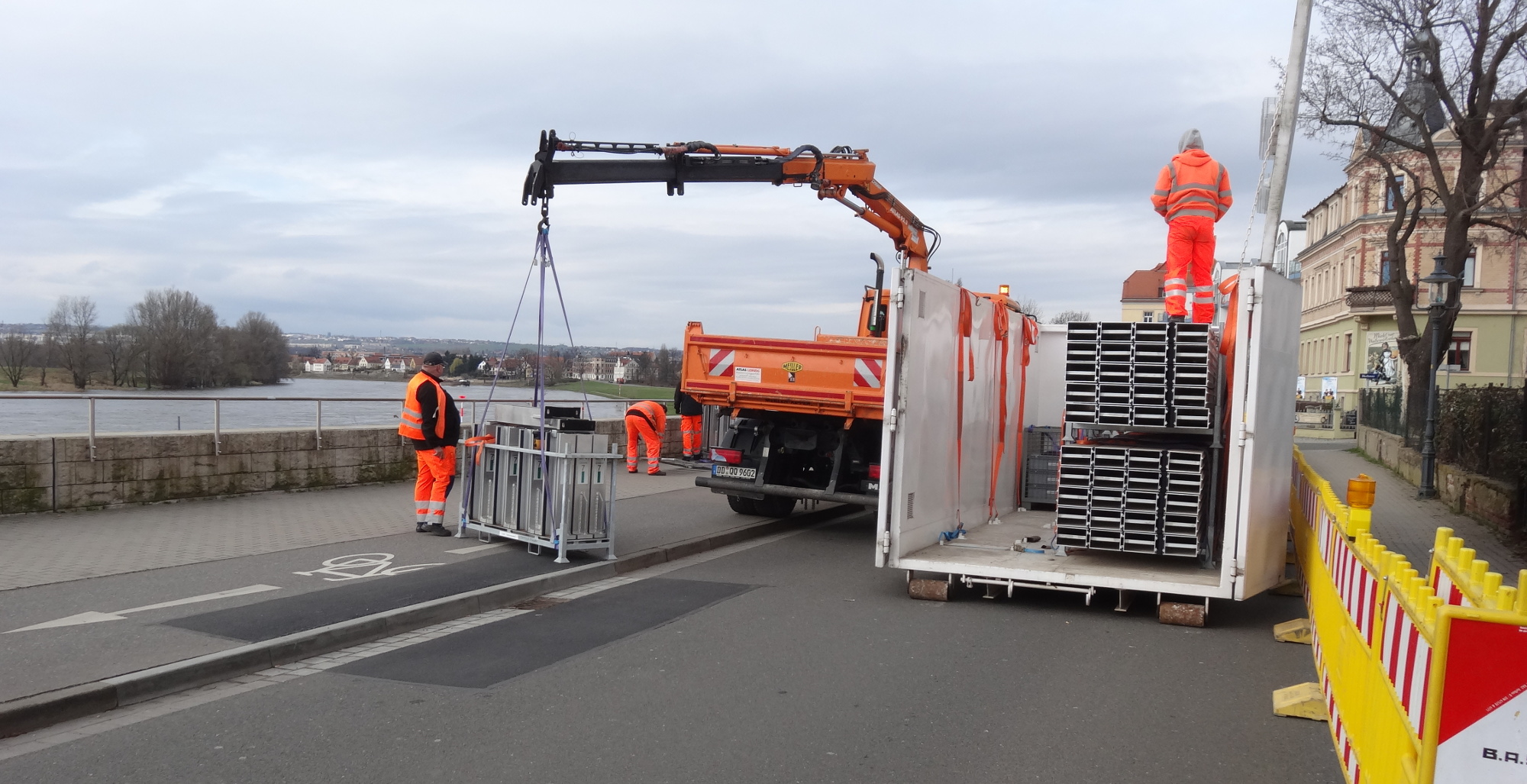 Am Donnerstag, 4. Mai 2023, wird in der Böcklinstraße in Pieschen eine mobile Hochwasserschutzanlage aufgebaut und gewartet. Die Anlage soll