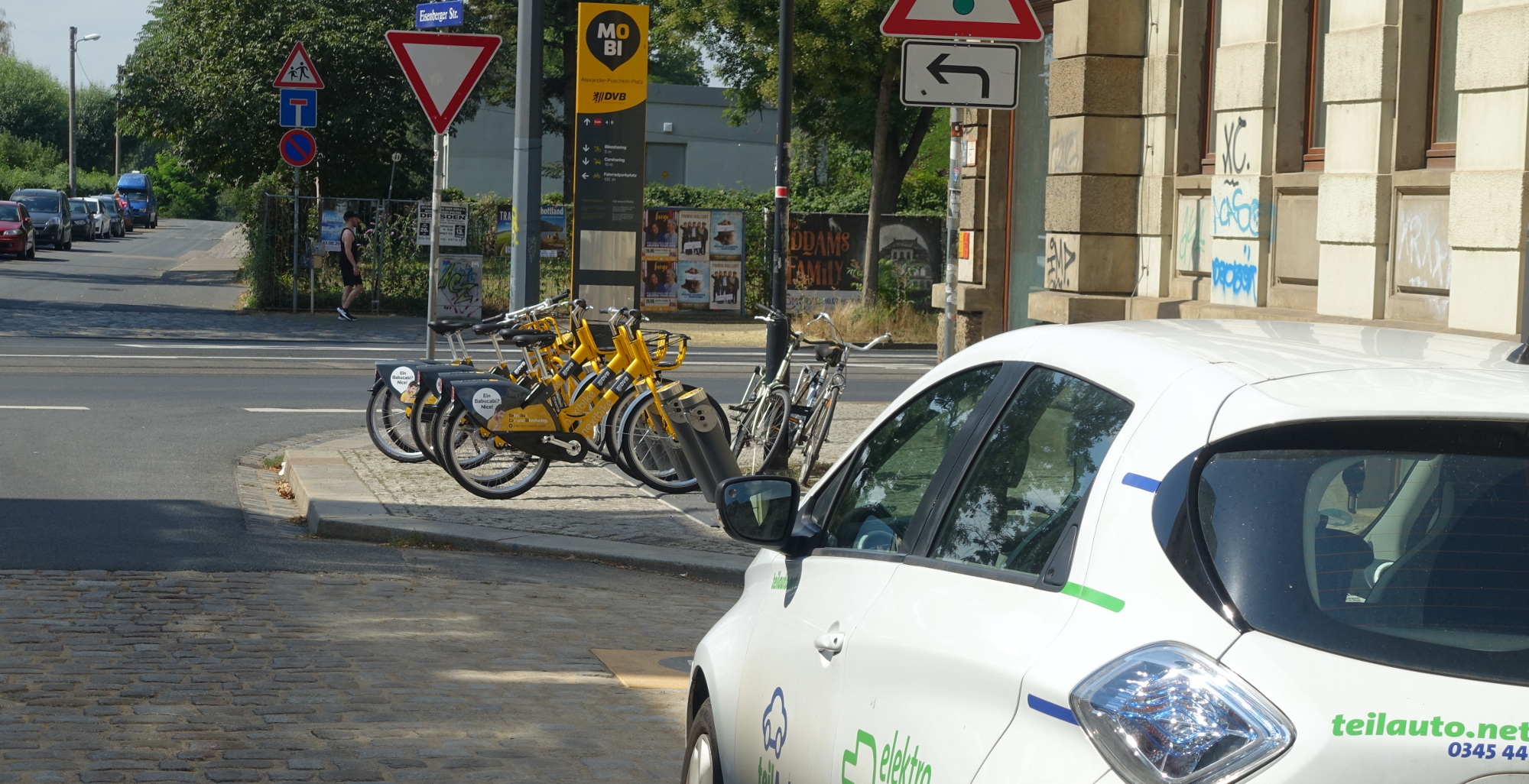 Am gerade fertig gestellten Mobipunkt Puschkinplatz in der Eisenberger Straße stehen bereits fünf nagelneue schwarz-gelbe Leihräder. Auch der Mobipunkt in