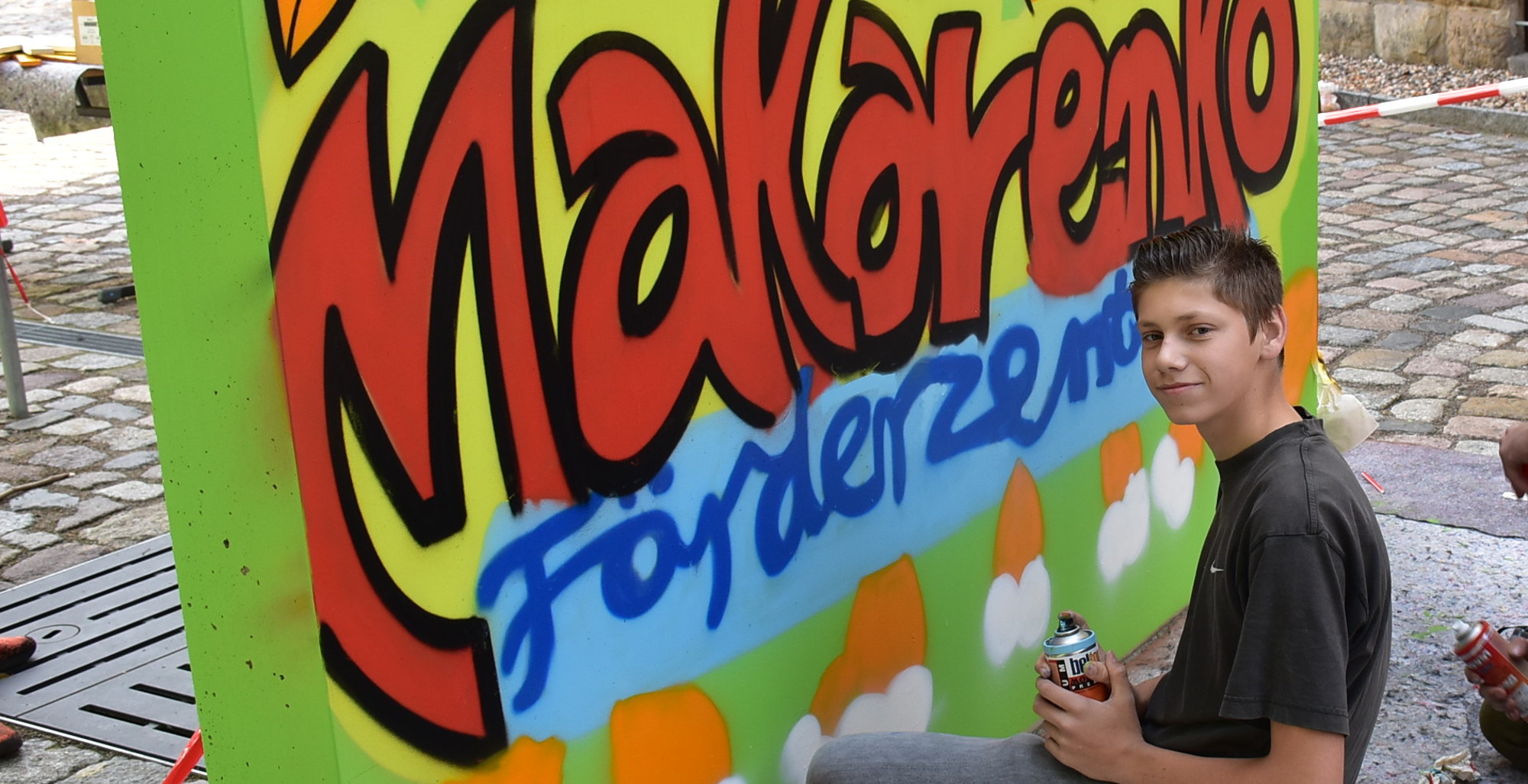Ein frisches großflächiges Graffiti entsteht gerade an der Kletter- und Graffitiwand auf dem Spielplatz in der Aachener Straße. Die Graffiti-Künstler