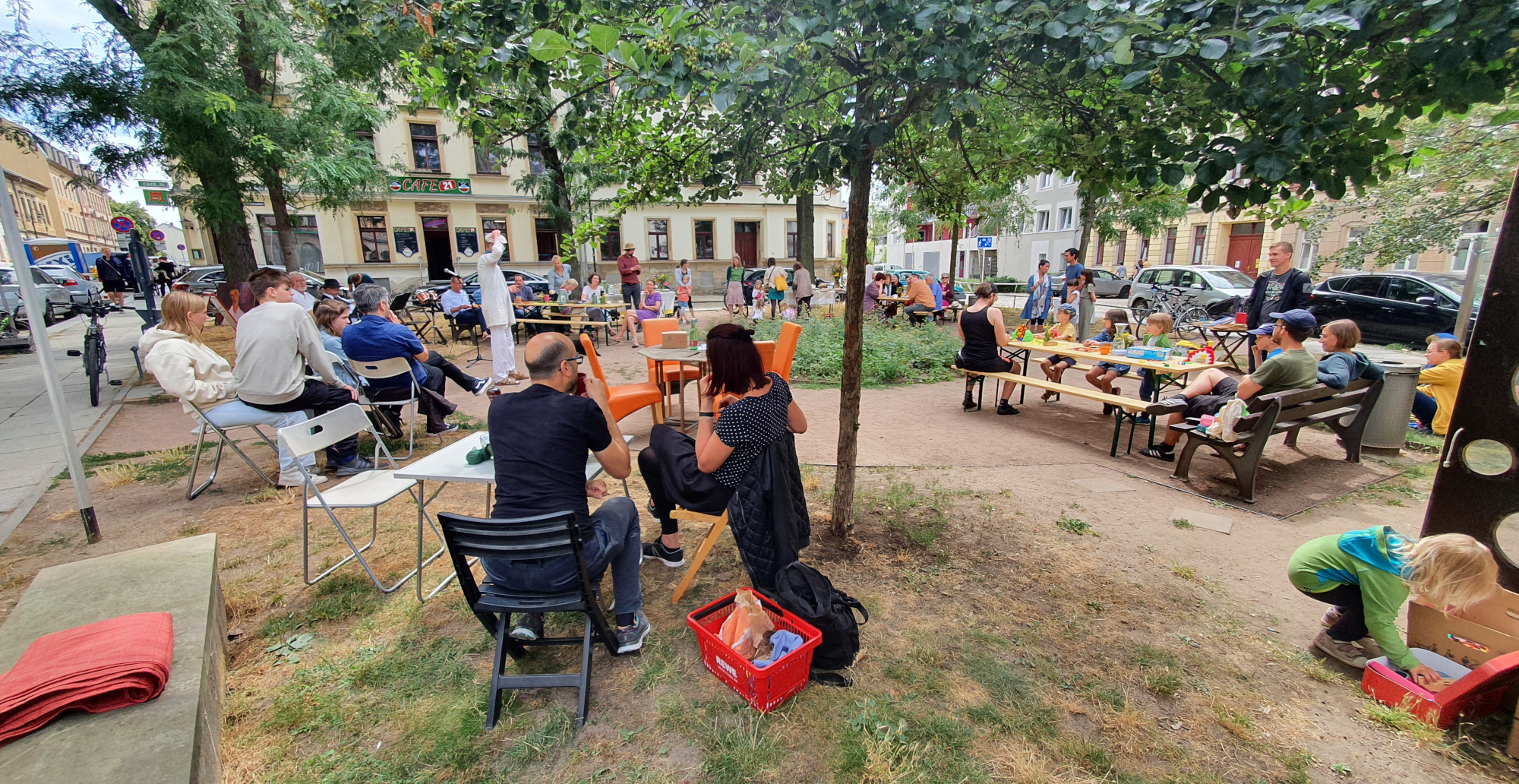 Unter dem grünen Baldachin der Bäume des Konkordienplatzes wurde den Gästen des Nachbarschaftsbrunchs ein herzliches und buntes Willkommen bereitet. Nicht
