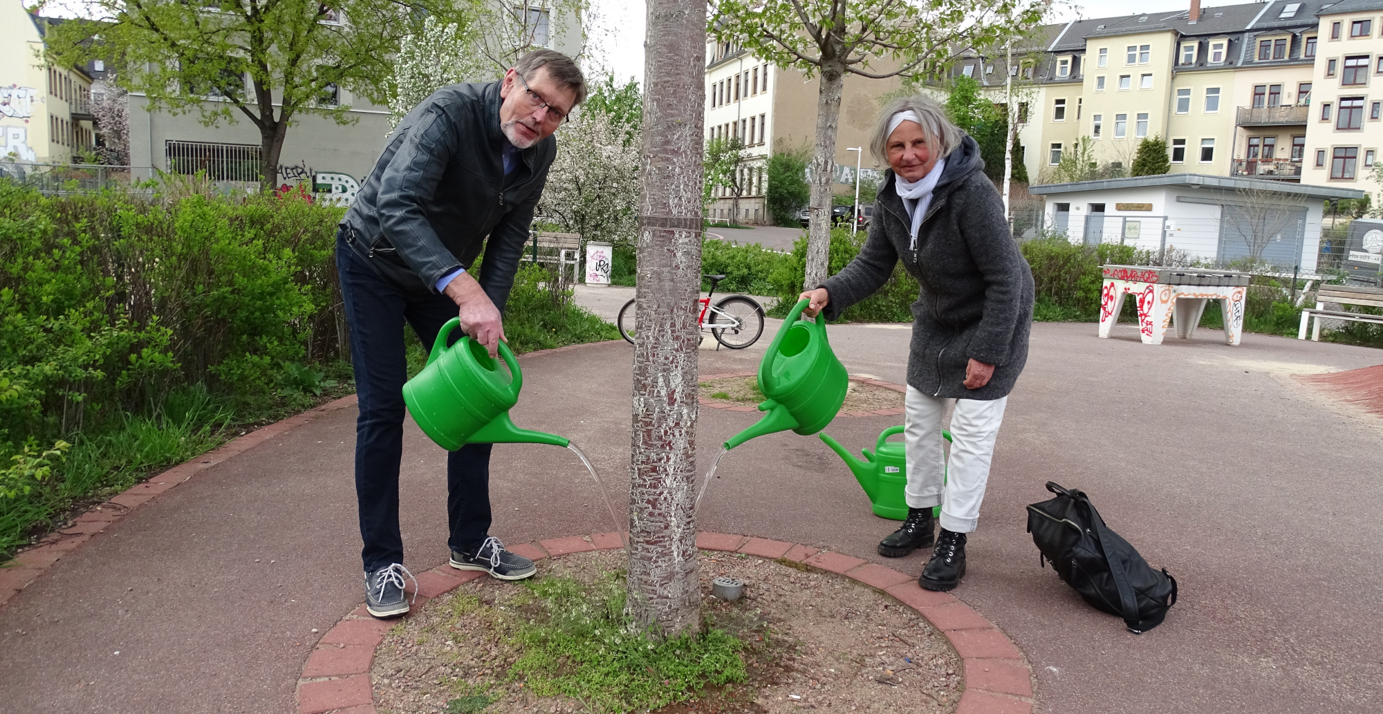 Am Konkordienplatz in Pieschen startete heute die Bewässerungskampagne „Dresden gießt“. Seit drei Jahren wird in verschiedenen Stadtteilen die Bewässerung von