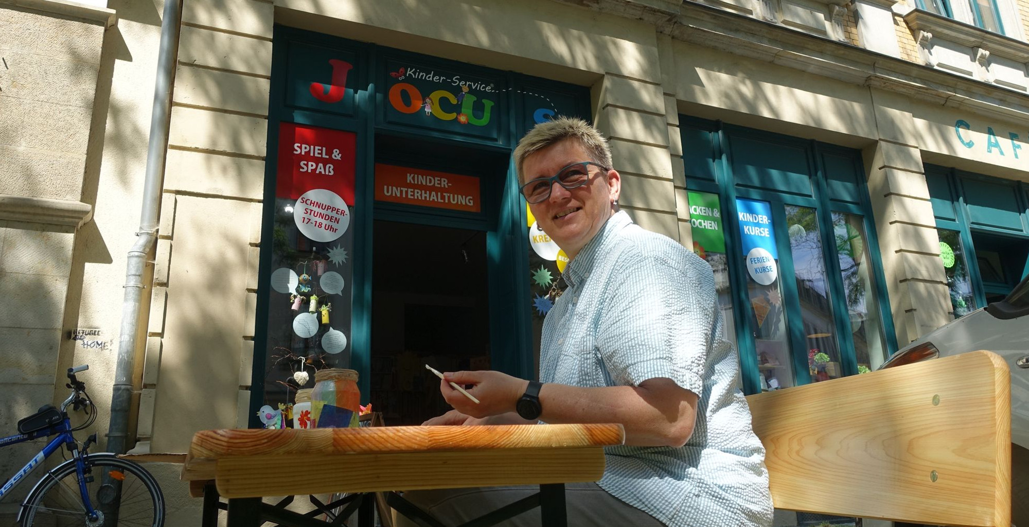 Die Tür zum Kinderservice Jocus in der Konkordienstaße steht wieder weit offen. Bei schönem Wetter sitzt Manuela Beßer auch gern