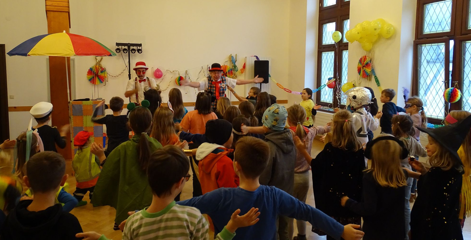 Die Akteure von „Karneval in Pieschen“ feierten heute mit Kindern aus der 26. Grundschule, der Kitas Pfiffikus und Bimbambino den