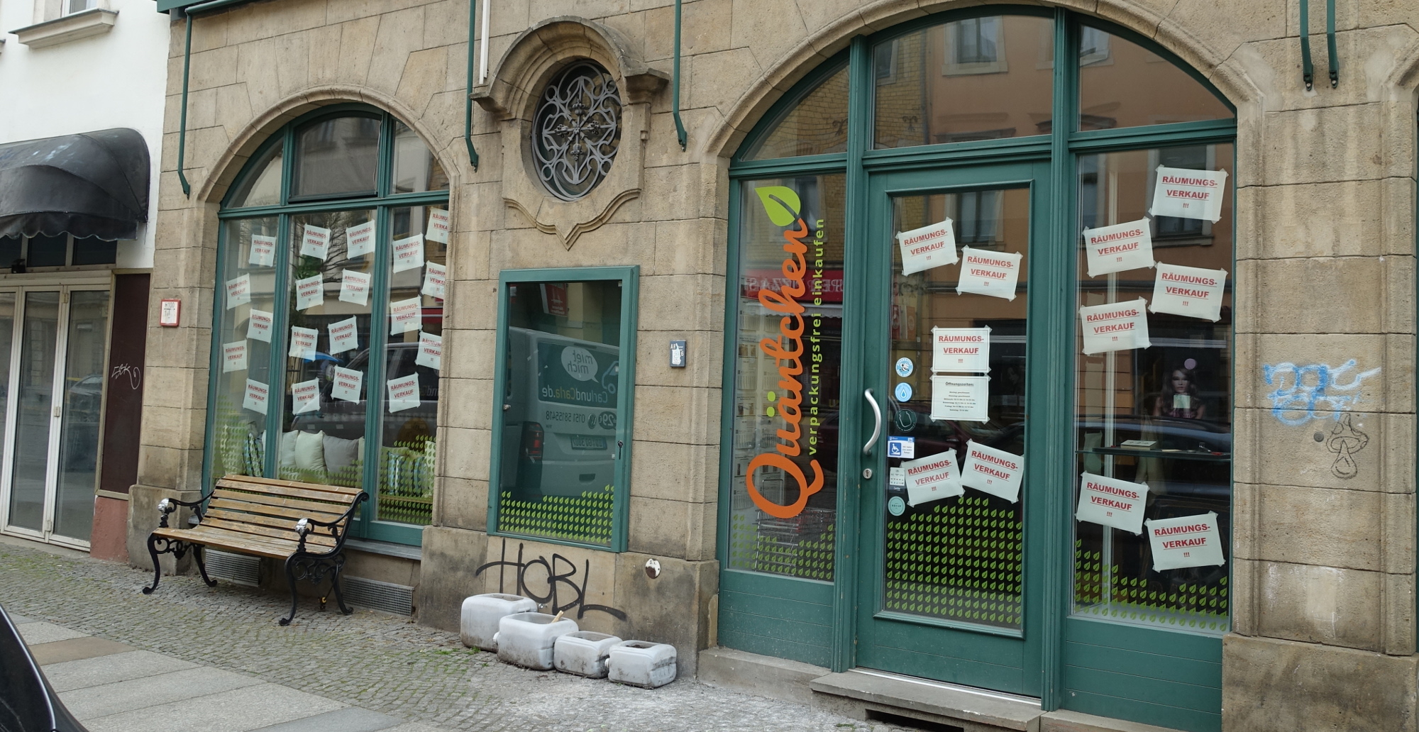 Sven Wruck hat über das Wochenende alles für den Räumungsverkauf im Unverpacktladen „Quäntchen“ in der Oschatzer Straße vorbereitet. Die Schaufenster